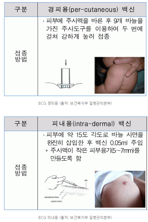 결핵 예방접종은 접종 방법에 따라 피내접종과 경피접종으로 구분됩니다.