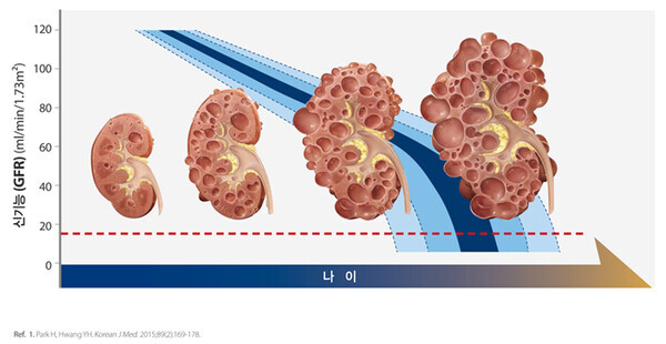 - 말기 신부전 : 서서히 콩팥 기능이 감소하여 40세 이후 뚜렷해지면, 55세에서 50%, 70세면 60%에서 투석 및 이식을 필요로 하는 말기 신부전 환자가 됩니다.