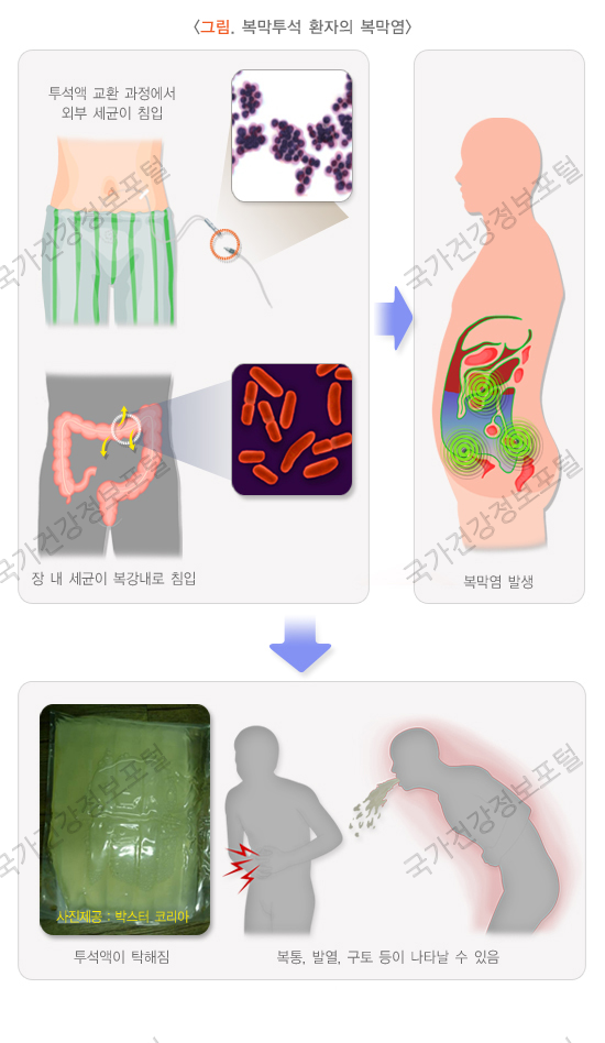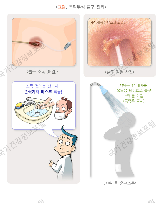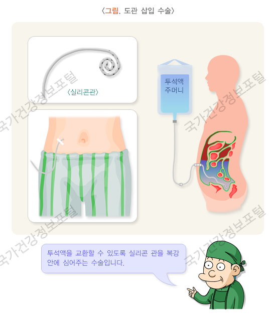 복막 투석 준비사항 : 투석 도관을 뱃속(복강)에 삽입하는 수술은 입원하여 국소 마취 또는 전신 마취하에 시행하며, 시술 후 3~4일 만에 퇴원이 가능합니다. 시술 후 2주 정도가 경과하여 환전히 아물게 되면  복막 투석을 시작합니다.