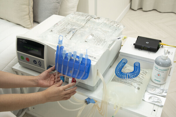 2. 투석 후 배액된 양과 색상, 냄새를 확인합니다. (배액 된 투석액이 말고 투명해야 정상, 붉거나 혼탁할 경우 복막염 가능성이 있으므로 병원을 방문하는 것이 좋습니다.)