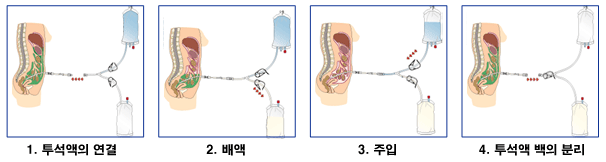 깨끗한 투석액을 뱃속에 주입(30~40분 소요)하여 주석액이 뱃속에 머무르는 동안(6~8시간)몸속에 높은 농도로 존재하는 노폐물과 수분이 삼투압의 원리에 의해 빠져 나옵니다. 투석액에 노폐물이 빠져 나오면 몸밖으로 배출 후(20~30분 소요) 새로운 투석액을 주입합니다.