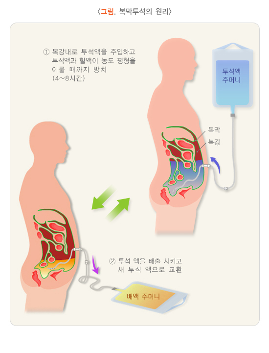 위 3단계의 원리로 반투막(복막, 인공적인 반투막 사용)을 이용한 노폐물과 체액을 인위적인 방법으로 제거합니다.