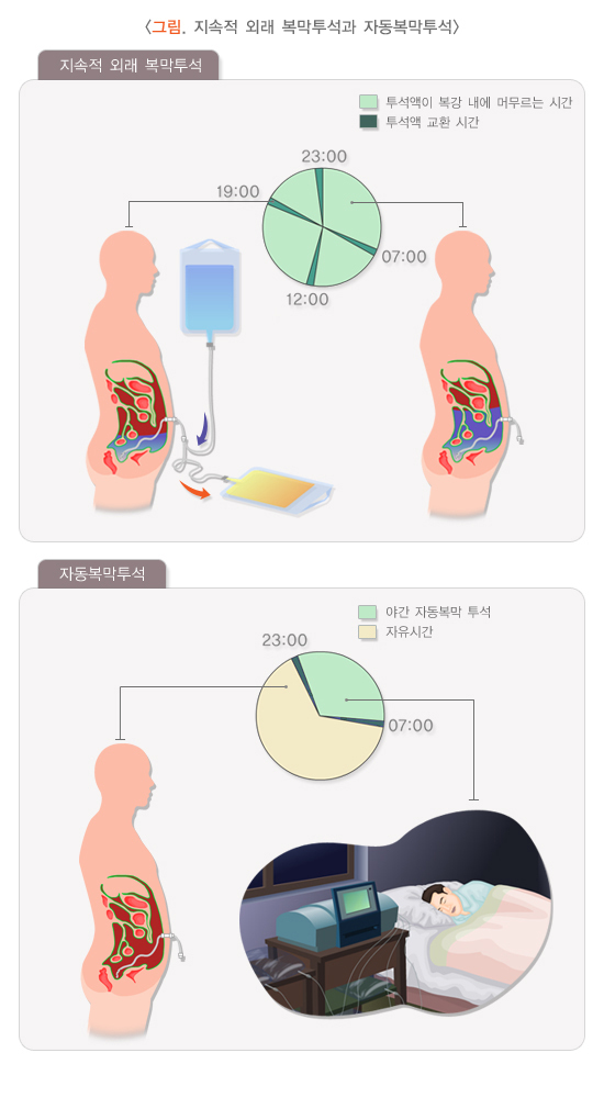 단점 | 1. 하루 2~4회 청결한 환경에서 투석액을 교환해야 하는 점이 번거로움. 2. 복막염이 생길 수 있음. 3. 복막투석 도관이 몸에 달려 있어 불편. 4. 간단한 샤워만 가능하며 통목욕은 불가능. |