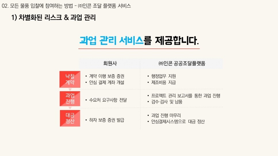 1. 차별화 된 리스크와 과업관리 : 낙찰 후 과업관리까지 지원해줘서 아무것도 몰라도 입찰 참여가 가능하다.
