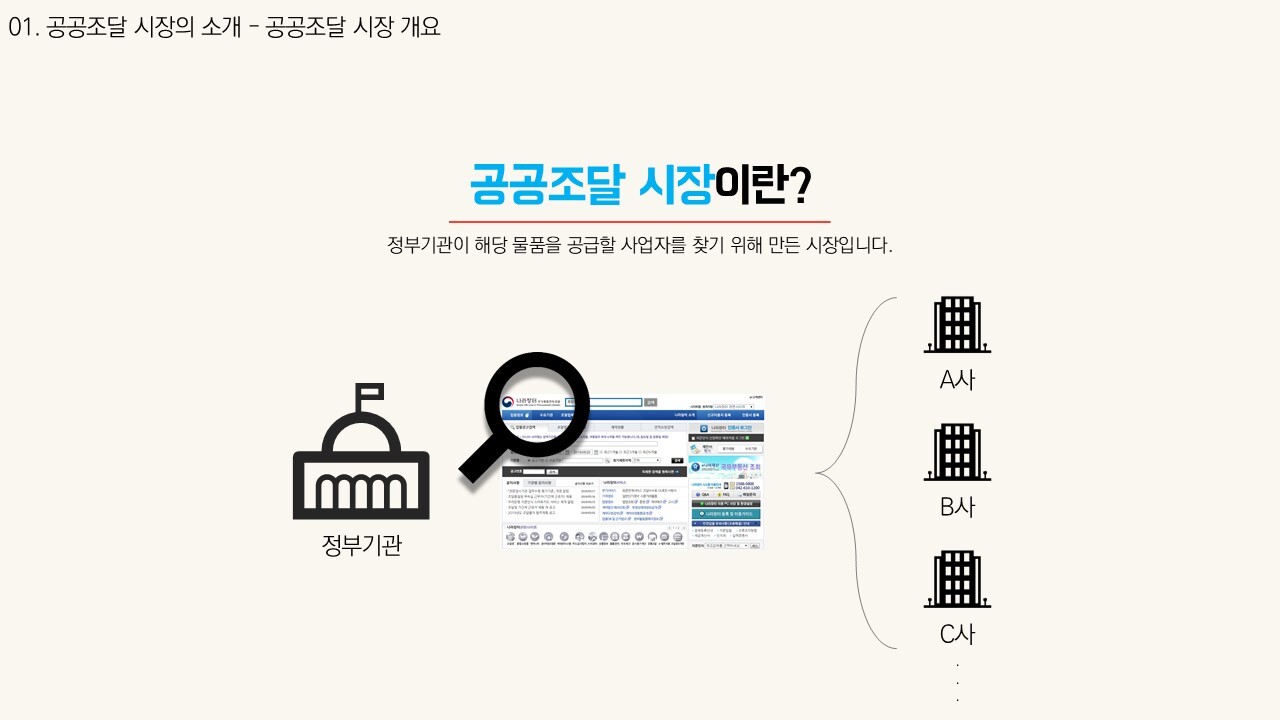 정부기관에 들어가는 물건들, 예를 들면 국공립 학교에 들어가는 공기청정기 같은 물건들을 정부가 사고 중소기업이 파는 시장이다. 공사, 용역, 물품 부분있는데 우리는 물폼 영역에서 활동을 하면 된다. 직접 물건을 만들지 않아도 참가가 가능하다.