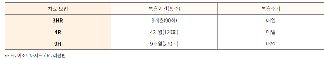 치료 : 잠복결핵감염 상태에서 결핵 치료제 중 1~2가지 약제를 3~9개월간 복용하며, 치료 시 결핵으로 발병하는 것을 약 60~90% 예방할 수 있습니다. 결핵 또는 잠복결핵감염으로 이미 진단 받았거나, 이를 치료 중이거나, 또는 이의 치료를 완료한 경우는 잠복결핵감염 검지능 받지 않아도 됩니다.