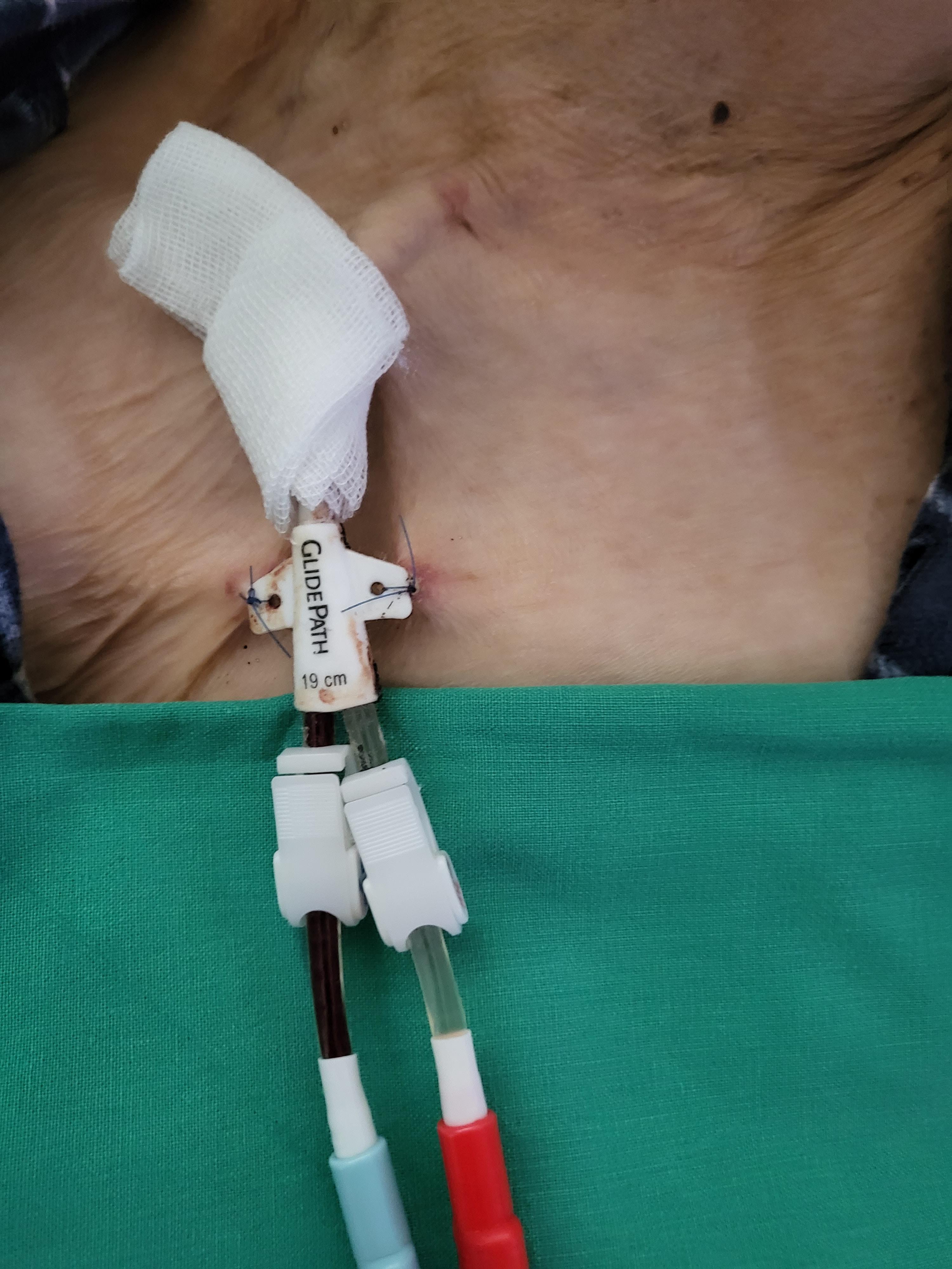 2~6개월 일시적인 투석을 위한 도관을 쇄골하 정맥에서 삽입되어 흉부에서 가장 큰 혈관인 상대 정맥을 지나 우심방에 위치한다. 카테터의 커프는 삽입 후 터널 피하조직과의 유착을 형성하게 되는데 이는 고정 기능과 감염에 대한 방어 역할을 하게 된다. 매 투석시 카테터 커프 위치와 카테터 윙이 피부와 잘 고정되어 있는지를 꼭 확인한다. 수술실에서 삽입한다. 특별한 일이 없다면 카테터 삽입 부위(목부위) 7일뒤, 날개 부위 봉합은 14일뒤 제거한다.